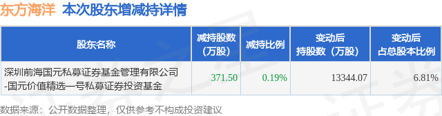 证券之星消息,11月17日东方海洋发布公告《东方海洋:关于持股5%以上股东减持股份实施情况的公告》,其股东深圳前海国元私募证券基金管理有限公司-国元价值精选一号私募证券投资基金于2025年11月11日至2025年11月17日间合计减持371.5万股,占公司目前总股本的0.1896%,变动期间该股股价上涨7.6%,截止11月17日收盘报2.83元。