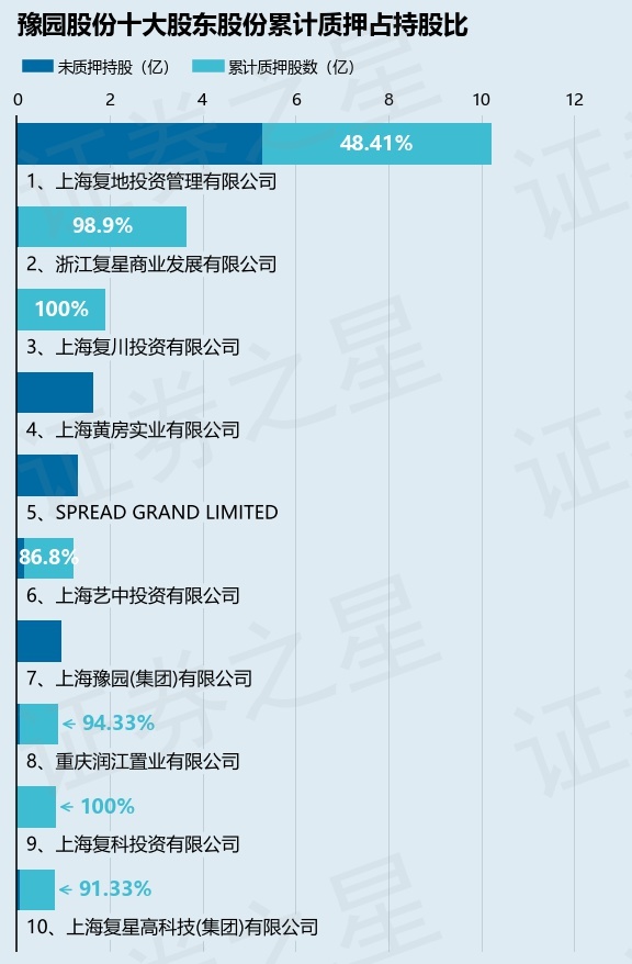 截止本公告日,股东上海复地投资管理有限公司已累计质押股份4.95亿股,占其持股总数的48.41%,股东浙江复星商业发展有限公司已累计质押股份3.61亿股,占其持股总数的98.9%,股东上海复川投资有限公司已累计质押股份1.9亿股,占其持股总数的100.0%,股东上海艺中投资有限公司已累计质押股份1.05亿股,占其持股总数的86.8%,股东重庆润江置业有限公司已累计质押股份8420.0万股,占其持股总数的94.33%,股东上海复科投资有限公司已累计质押股份8438.97万股,占其持股总数的100.0%,股东上海复星高科技(集团)有限公司已累计质押股份7457.0万股,占其持股总数的91.33%。本次质押后豫园股份十大股东的累计质押股份占持股比例(占持股比例的计算以公司最新一期财务报表公布的十大股东的持股总数为基准)见下图: