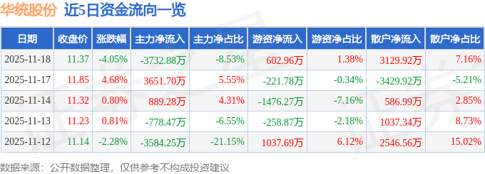 证券之星消息,截至2025年11月18日收盘,华统股份(002840)报收于11.37元,下跌4.05%,换手率6.08%,成交量38.29万手,成交额4.37亿元。