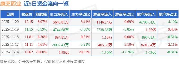 证券之星消息,截至2025年11月20日收盘,康芝药业(300086)报收于12.15元,上涨8.97%,换手率31.86%,成交量140.39万手,成交额16.56亿元。