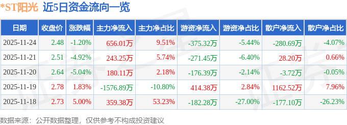 证券之星消息,截至2025年11月24日收盘,*ST阳光(000608)报收于2.48元,下跌1.2%,换手率3.77%,成交量28.14万手,成交额6894.68万元。