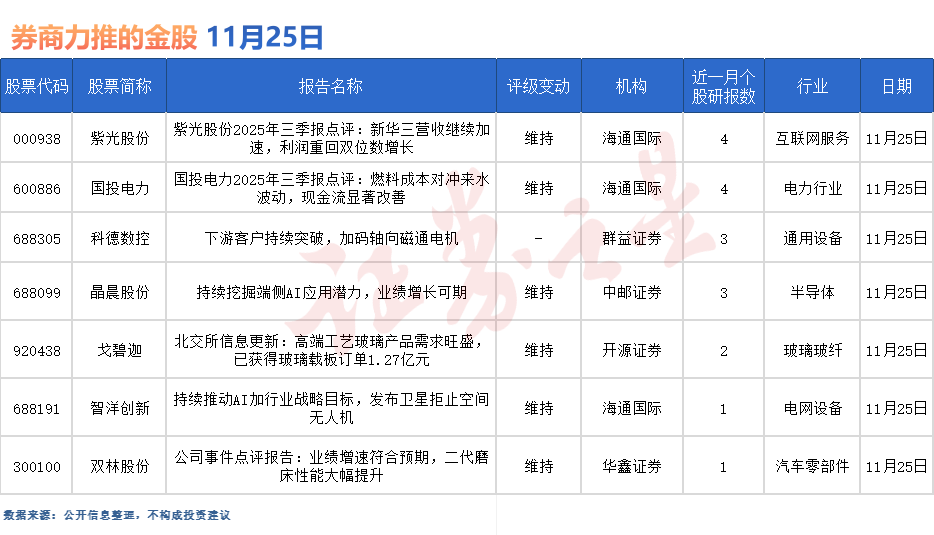 紫光股份最受券商关注,近一个月获国信证券、开源证券、国金证券等4份券商研报关注,位居11月25日券商力推股榜首。