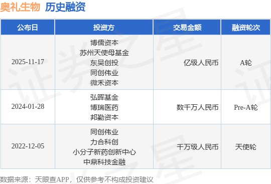 证券之星消息,根据天眼查APP于11月17日公布的信息整理,深圳奥礼生物科技有限公司A轮融资,融资额亿级人民币,参与投资的机构包括博儒资本,苏州天使母基金,东吴创投,同创伟业,微禾资本。