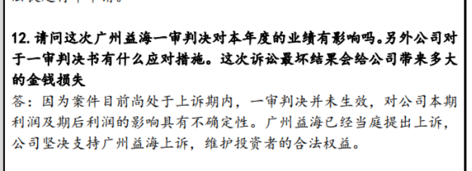 证券之星注意到,在说明会当天回复投资者提问中,公司方面还提到,其认为一审判决广州益海承担18.81亿元损失赔偿没有依据,并认为并没有证据证明柳德刚有帮助云南惠嘉诈骗安徽华文的行为。