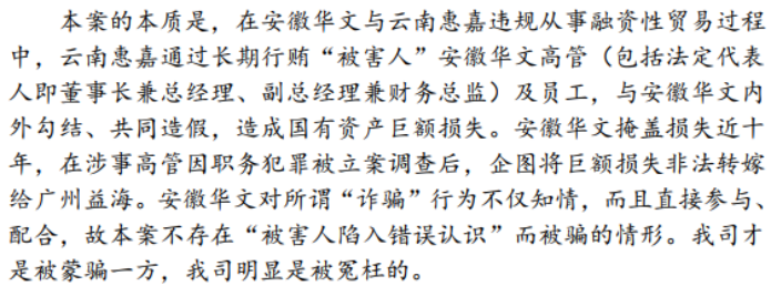 而在金龙鱼召开的11月21日召开的投资者说明会中,房彦江坚称广州益海被冤枉。房彦江称,本案的本质是,在安徽华文与云南惠嘉违规从事融资性贸易过程中,云南惠嘉通过长期行贿“被害人”安徽华文高管及员工,与安徽华文内外勾结、共同造假,造成国有资产巨额损失。安徽华文掩盖损失近十年,在涉事高管因职务犯罪被立案调查后,企图将巨额损失非法转嫁给广州益海。安徽华文对所谓“诈骗”行为不仅知情,而且直接参与、配合,故本案不存在“被害人陷入错误认识”而被骗的情形。“我司才是被蒙骗一方。”