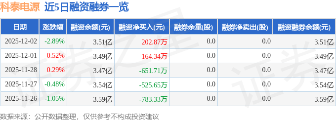 科泰电源融资融券信息显示,融资方面,当日融资买入1977.55万元,融资偿还1774.67万元,融资净买入202.87万元。融券方面,融券卖出0.0股,融券偿还0.0股,融券余量0.0股,融券余额0.0万元。融资融券余额3.51亿元。