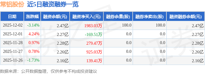 常铝股份融资融券信息显示,融资方面,当日融资买入4422.16万元,融资偿还2439.12万元,融资净买入1983.03万元。融券方面,融券卖出100.0股,融券偿还0.0股,融券余量100.0股,融券余额0.05万元。融资融券余额2.47亿元。