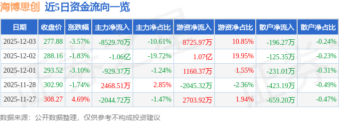 证券之星消息,截至2025年12月3日收盘,海博思创(688411)报收于277.88元,下跌3.57%,换手率7.56%,成交量2.87万手,成交额8.04亿元。