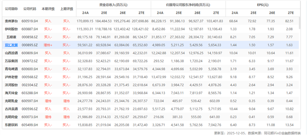 行业重点公司最新盈利预测综合值