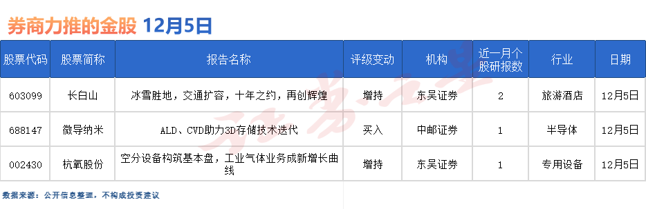 据证券之星数据库不完全统计,12月5日券商共给予3家A股上市公司“买入”评级。从行业分布看,券商12月5日关注的个股聚焦于旅游酒店、半导体、专用设备等行业。
