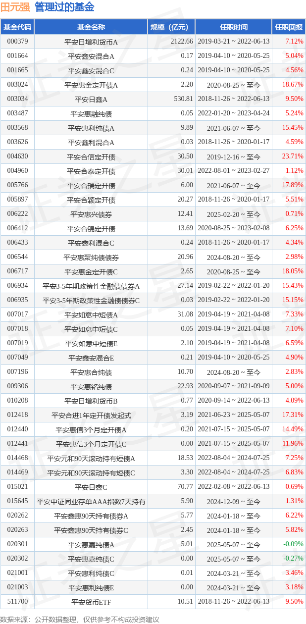 田元强先生:中国国籍,西安交通大学工商管理硕士,曾先后担任鹏元资信评估有限公司信用评级部分析师、生命保险资产管理有限公司信用评估部分析师、中国中投证券有限责任公司研究总部分析员。2016年11月加入平安基金管理有限公司,曾任固定收益投资中心固定收益高级研究员。现任固定收益投资中心研究部负责人。现担任平安合信3个月定期开放债券型发起式证券投资基金(2019-12-16至今)、平安惠金定期开放债券型证券投资基金(2020-08-25至今)、平安惠利纯债债券型证券投资基金(2021-06-07至今)、平安合瑞定期开放债券型发起式证券投资基金(2021-06-07至2025年11月18日)、平安合进1年定期开放债券型发起式证券投资基金(2021-06-23至2025-05-07)、平安惠信3个月定期开放债券型证券投资基金(2021-07-15至2025-05-07)、平安鑫惠90天持有期债券型证券投资基金(2024-01-18至今)基金经理。曾管理的基金名称及管理时间:平安合颖定期开放纯债债券型发起式证券投资基金(2018-11-26至2020-01-17)、平安鑫利灵活配置混合型证券投资基金(2018-11-26至2020-01-17)、平安鑫安混合型证券投资基金(2019-04-10至2020-05-25)、平安如意中短债债券型证券投资基金(2019-04-19至2021-04-08)、平安惠铭纯债债券型证券投资基金(2020-09-07至2021-09-09)、平安3-5年期政策性金融债债券型证券投资基金(2019-02-22至2022-01-20)、平安交易型货币市场基金(2018-11-26至2022-06-13)、平安日增利货币市场基金(2019-03-21至2022-06-13)、平安合锦定期开放债券型发起式证券投资基金(2020-08-25至2023-02-08)、平安惠融纯债债券型证券投资基金(2022-01-20至2023-04-24)。曾任平安元和90天滚动持有短债债券型证券投资基金基金经理。2024年08月20日至2025年12月2日任平安惠聚纯债债券型证券投资基金基金经理。2024年12月09日担任平安中证同业存单AAA指数7天持有期证券投资基金基金经理。2025年2月20日担任平安惠兴纯债债券型证券投资基金基金经理。2025年05月07日起担任平安惠嘉纯债债券型证券投资基金基金经理。曾任平安惠合纯债债券型证券投资基金基金经理。2025年11月18日任平安增利六个月定期开放债券型证券投资基金、平安惠享纯债债券型证券投资基金基金经理。