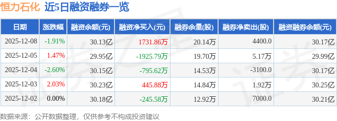 恒力石化融资融券信息显示,融资方面,当日融资买入4862.11万元,融资偿还3130.25万元,融资净买入1731.86万元。融券方面,融券卖出7800.0股,融券偿还3400.0股,融券余量20.14万股,融券余额382.46万元。融资融券余额30.17亿元。