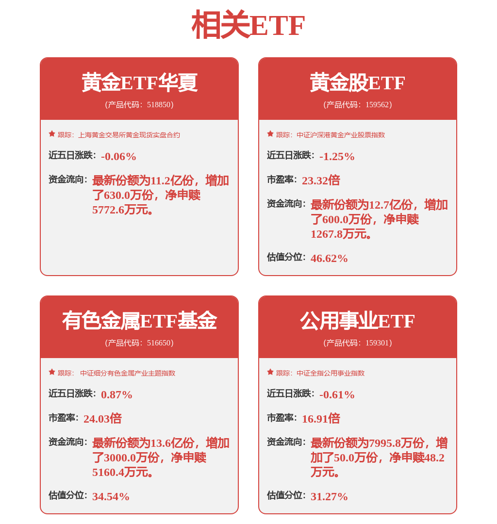 12月11日,三大股指早盘小幅拉升,其中黄金板块持续上行。截至上午9:40,黄金ETF华夏(518850)涨0.70%、黄金股ETF(159562)涨2.17%。相关成分股中山金国际涨6.59%、紫金矿业涨4.00%、赤峰黄金涨3.66%,山东黄金、中金黄金、铜陵有色等小幅跟涨。(以上所列股票仅为指数成份股,无特定推荐之意)