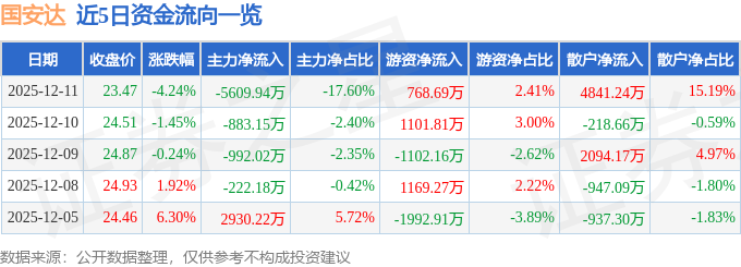 证券之星消息,截至2025年12月11日收盘,国安达(300902)报收于23.47元,下跌4.24%,换手率11.05%,成交量13.4万手,成交额3.19亿元。