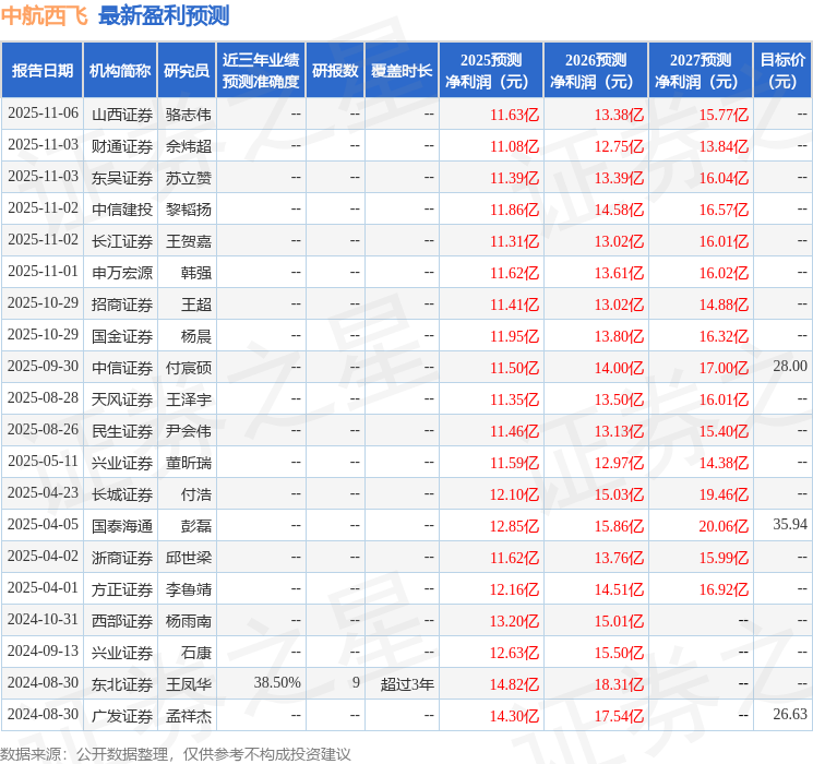 中航西飞2025年三季报显示,前三季度公司主营收入302.44亿元,同比上升4.94%;归母净利润9.92亿元,同比上升5.15%;扣非净利润9.56亿元,同比上升7.94%;其中2025年第三季度,公司单季度主营收入108.28亿元,同比上升27.51%;单季度归母净利润3.03亿元,同比上升5.89%;单季度扣非净利润3.04亿元,同比上升15.15%;负债率70.58%,投资收益3825.53万元,财务费用-5814.97万元,毛利率6.79%。