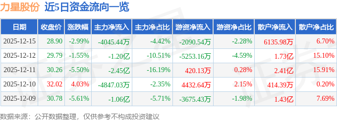 证券之星消息,截至2025年12月15日收盘,力星股份(300421)报收于28.9元,下跌2.99%,换手率13.77%,成交量31.72万手,成交额9.16亿元。