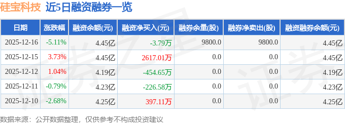 硅宝科技融资融券信息显示,融资方面,当日融资买入3988.92万元,融资偿还3992.71万元,融资净偿还3.79万元。融券方面,融券卖出9800.0股,融券偿还0.0股,融券余量9800.0股,融券余额19.64万元。融资融券余额4.45亿元。