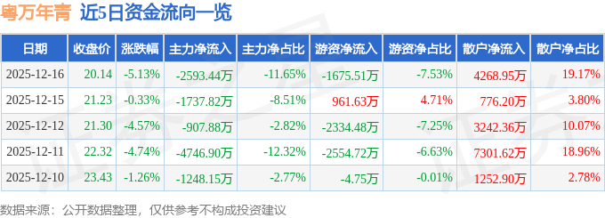 12月16日的资金流向数据方面,主力资金净流出2593.44万元,占总成交额11.65%,游资资金净流出1675.51万元,占总成交额7.53%,散户资金净流入4268.95万元,占总成交额19.17%。