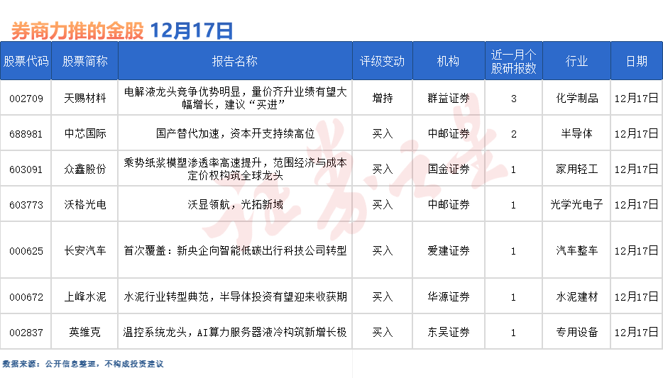天赐材料最受券商关注,近一个月获开源证券、华安证券等3份券商研报关注,位居12月17日券商力推股榜首。