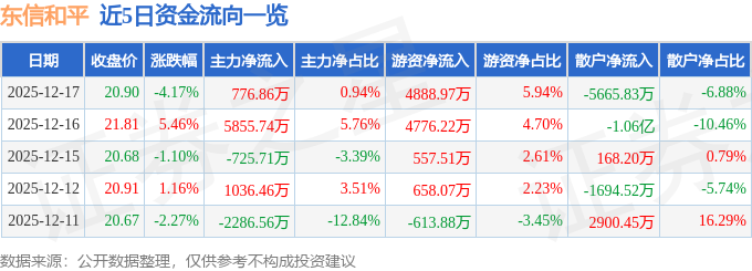 证券之星消息,截至2025年12月17日收盘,东信和平(002017)报收于20.9元,下跌4.17%,换手率6.87%,成交量39.87万手,成交额8.23亿元。