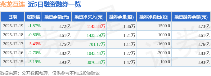 兆龙互连融资融券信息显示,融资方面,当日融资买入3407.48万元,融资偿还2261.63万元,融资净买入1145.84万元。融券方面,融券卖出2200.0股,融券偿还700.0股,融券余量1.36万股,融券余额71.62万元。融资融券余额3.73亿元。