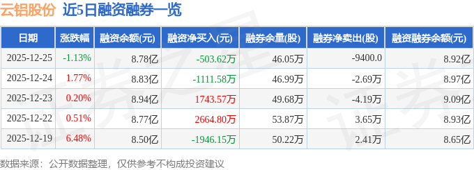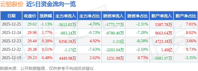 证券之星消息,截至2025年12月25日收盘,云铝股份(000807)报收于29.62元,下跌1.13%,换手率0.75%,成交量26.16万手,成交额7.69亿元。