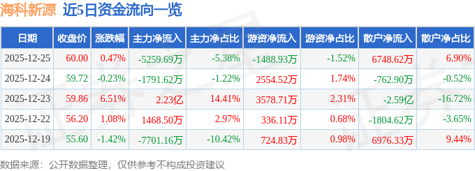 12月25日的资金流向数据方面,主力资金净流出5259.69万元,占总成交额5.38%,游资资金净流出1488.93万元,占总成交额1.52%,散户资金净流入6748.62万元,占总成交额6.9%。
