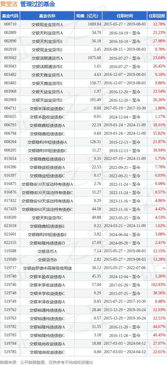 黄莹洁女士:中国国籍。香港大学工商管理硕士、北京大学经济学、管理学双学士。历任中海基金管理有限公司交易员。2012年加入交银施罗德基金管理有限公司,历任中央交易室交易员。2015年7月25日至2018年3月18日担任交银施罗德丰泽收益债券型证券投资基金的基金经理。2015年5月27日至2019年8月2日担任交银施罗德货币市场证券投资基金、交银施罗德现金宝货币市场基金的基金经理。2016年12月7日至2019年8月2日担任交银施罗德天鑫宝货币市场基金的基金经理。2015年12月29日至2019年10月23日担任交银施罗德裕通纯债债券型证券投资基金的基金经理。2015年5月27日至2020年7月27日担任转型前的交银施罗德理财21天债券型证券投资基金的基金经理。2020年7月28日至2022年7月5日担任交银施罗德中高等级信用债债券型证券投资基金的基金经理。2017年3月3日至2024年4月11日担任交银施罗德境尚收益债券型证券投资基金的基金经理。2019年1月24日至2024年11月8日担任交银施罗德稳鑫短债债券型证券投资基金的基金经理。2024年12月04日起任交银施罗德丰盈收益债券型证券投资基金基金经理。