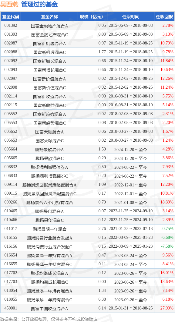 吴西燕女士:上海财经大学硕士,历任中国建设银行深圳分行会计,国海富兰克林基金管理有限公司研究助理、研究员、高级研究员、国富弹性市值股票基金(现变更为国富弹性市值混合基金)和国富深化价值股票基金(现变更为国富深化价值混合基金)基金经理助理。现任国海富兰克林基金管理有限公司行业研究主管,国富中国收益混合基金基金经理、国富金融地产混合基金基金经理。2021年1月8日起担任鹏扬景合六个月持有期混合型证券投资基金基金经理。2021年1月25日起担任现任鹏扬基金管理有限公司股票投资部基金经理。2021年1月25日至2022年7月13日担任鹏扬景明一年持有期混合型证券投资基金基金经理。2022年11月25日至2024年9月10日担任鹏扬景创混合型证券投资基金基金经理。2022年12月1日担任鹏扬景泓回报灵活配置混合型证券投资基金基金经理。现任鹏扬添利增强债券型证券投资基金基金经理。2024年12月20日担任鹏扬景欣混合型证券投资基金基金经理。曾任鹏扬消费行业混合型发起式证券投资基金基金经理。