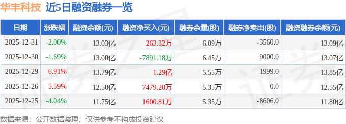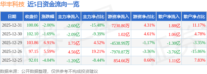 证券之星消息,截至2025年12月31日收盘,华丰科技(688629)报收于100.06元,下跌2.0%,换手率9.13%,成交量16.59万手,成交额16.79亿元。