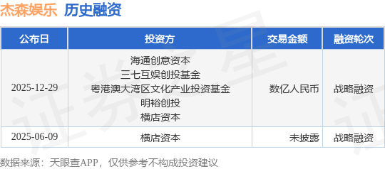 证券之星消息,根据天眼查APP于12月29日公布的信息整理,广东杰森娱乐发展有限公司战略融资,融资额数亿人民币,参与投资的机构包括海通创意资本,三七互娱创投基金,粤港澳大湾区文化产业投资基金,明裕创投,横店资本。