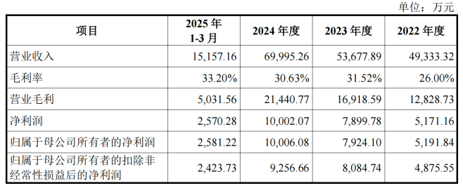 招股书显示,2022年至2024年,公司营业收入从4.93亿元增长至7亿元,归母净利润由5191.84万元提升至1亿元,整体业绩保持增长。然而,在财务数据向好的背后,却隐藏多重压力。
