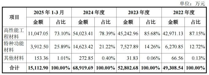 另一方面,被公司视为新增长动力的特种功能材料板块收入持续攀升,尤其在2024年同比增长近50%,但目前该业务营收占比仍相对较低。此外,尽管该板块销售单价高于高性能工程材料,但报告期内亦呈现波动下行趋势。各期单价分别为4.76万元/吨、4.49万元/吨、4.55万元/吨和4.51万元/吨。