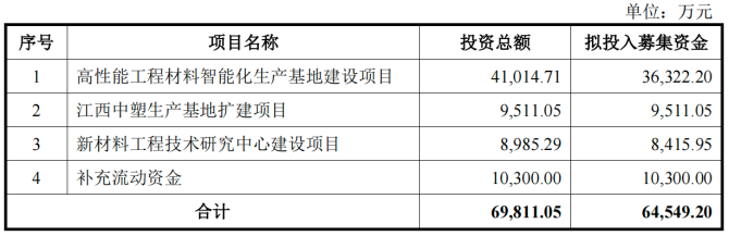 招股书显示,中塑股份拟募集资金6.45亿元,其中超七成将用于“高性能工程材料智能化生产基地”和“江西中塑生产基地扩建”两大项目。公司计划通过购置自动化生产线并应用智能化生产管理软件,建设自动化水平更高的智能生产基地,以实现高性能工程材料、特种功能材料及其他改性塑料的规模化生产。