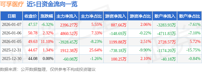 1月7日的资金流向数据方面,主力资金净流入2396.27万元,占总成交额5.55%,游资资金净流入887.66万元,占总成交额2.06%,散户资金净流出3283.93万元,占总成交额7.61%。