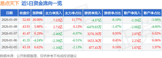 1月9日的资金流向数据方面,主力资金净流入7.22亿元,占总成交额11.77%,游资资金净流出4.97亿元,占总成交额8.1%,散户资金净流出2.26亿元,占总成交额3.68%。