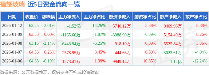 证券之星消息,截至2026年1月12日收盘,福耀玻璃(600660)报收于62.25元,下跌2.01%,换手率0.85%,成交量17.08万手,成交额10.66亿元。