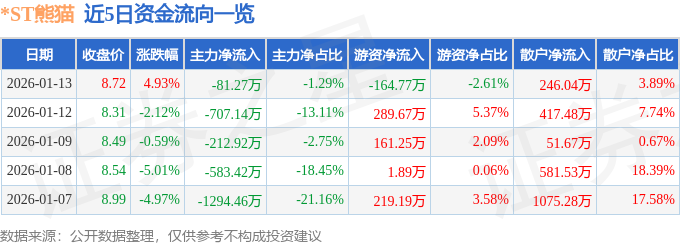 证券之星消息,截至2026年1月13日收盘,*ST熊猫(600599)报收于8.72元,上涨4.93%,换手率4.45%,成交量7.38万手,成交额6317.49万元。
