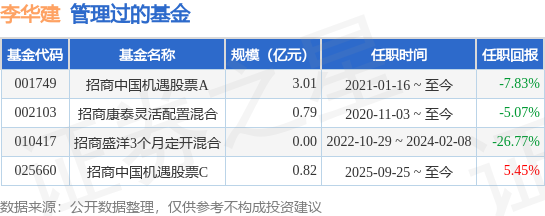 李华建先生:中国国籍,硕士研究生,2003年7月至2020年9月在中国人寿资产管理有限公司工作,曾任投资分析部研究员、基金投资部高级投资经理、股票投资部总经理助理及信用管理部副总经理等职务,从事证券研究分析、证券投资以及管理等工作。2020年9月加入招商基金管理有限公司,现任投资管理一部高级基金经理。2020年11月3日起担任招商康泰灵活配置混合型证券投资基金基金经理。2021年1月16日任招商中国机遇股票型证券投资基金基金经理。2022年10月29日起担任招商盛洋3个月定期开放混合型发起式证券投资基金基金经理。