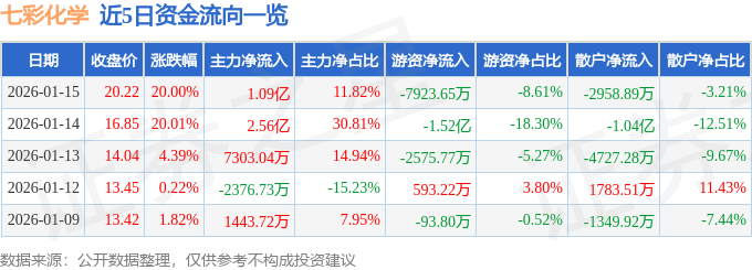 证券之星消息,截至2026年1月15日收盘,七彩化学(300758)报收于20.22元,上涨20.0%,已连续涨停2天,换手率12.46%,成交量45.63万手,成交额9.21亿元。
