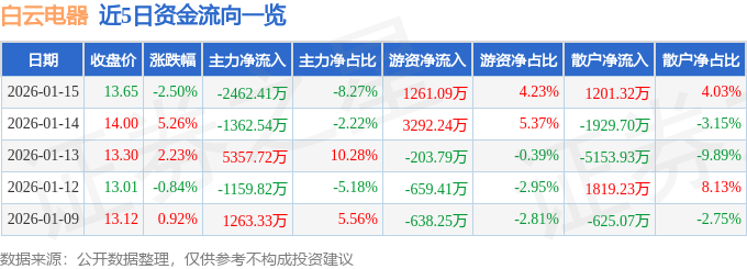 证券之星消息,截至2026年1月15日收盘,白云电器(603861)报收于13.65元,下跌2.5%,换手率4.1%,成交量21.67万手,成交额2.98亿元。