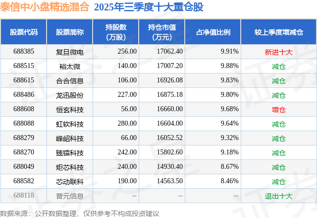 根据2025基金Q3季报公募基金重仓股数据,重仓该股的公募基金共5家,其中持有数量最多的公募基金为泰信基金的泰信中小盘精选混合。泰信中小盘精选混合目前规模为17.22亿元,最新净值5.448(1月15日),较上一交易日上涨0.17%,近一年上涨61.81%。该公募基金现任基金经理为董季周。董季周在任的基金产品包括:泰信鑫选灵活配置混合A,管理时间为2020年11月24日至今,期间收益率为39.19%。