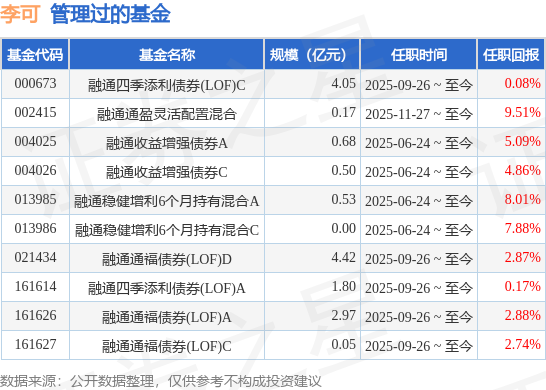 李可先生:中国国籍,清华大学硕士。2015年7月至2017年4月在上海银行股份有限公司工作,担任总行管理培训生;2017年4月至2020年9月在中信银行股份有限公司工作,担任投资经理;2020年9月至2022年7月在信银理财有限责任公司工作,担任投资经理;2022年7月至2024年11月在申万宏源证券有限公司资产管理事业部(现为申万宏源证券资产管理有限公司)工作,担任投资经理。2024年11月加入融通基金管理有限公司。2025年6月24日担任融通收益增强债券型证券投资基金基金经理、融通稳健增利6个月持有期混合型证券投资基金基金经理、融通稳健增利6个月持有期混合型证券投资基金基金经理。2025年9月26日起任融通通福债券型证券投资基金(LOF)、融通四季添利债券型证券投资基金(LOF)基金经理。2025年11月27日任融通通盈灵活配置混合型证券投资基金基金经理。