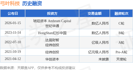 证券之星消息,根据天眼查APP于1月15日公布的信息整理,杭州弓叶科技有限公司C轮融资,融资额数亿人民币,参与投资的机构包括琥珀资本 Ambrum Capital,世纪华通。