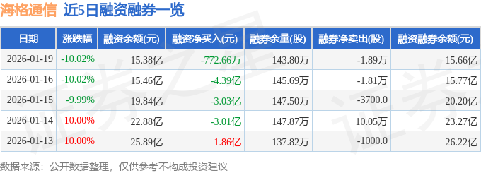 证券之星消息,截至2026年1月19日收盘,海格通信(002465)报收于19.4元,下跌10.02%,已连续跌停3天,换手率1.52%,成交量37.69万手,成交额7.31亿元。