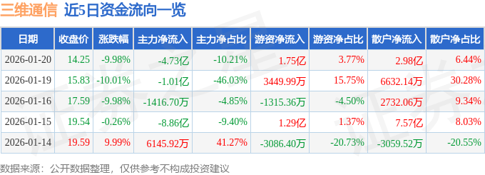 证券之星消息,截至2026年1月20日收盘,三维通信(002115)报收于14.25元,下跌9.98%,已连续跌停3天,换手率42.44%,成交量319.24万手,成交额46.32亿元。