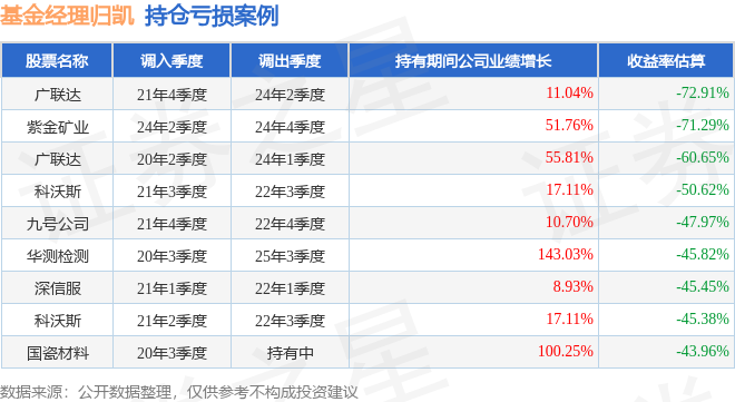 重仓股调仓示例详解: 1、汇川技术(300124)翻倍案例: 归凯管理的嘉实泰和混合基金在19年4季度买入汇川技术,在持有3年又1个季度后在23年1季度卖出。持有期间的估算收益率为287.13%,持有期间汇川技术在2019年到2023年的年报归属净利润增幅达398.13%。 2、信维通信(300136)调仓案例: 归凯管理的嘉实泰和混合基金在16年3季度买入信维通信,在持有1年又2个季度后在18年1季度卖出。持有期间的估算收益率为90.04%,持有期间信维通信在2016年到2018年的年报营业总收入增幅达95.07%。 3、广联达(002410)折戟案例: 归凯管理的嘉实领先成长混合基金在21年4季度买入广联达,在持有2年又2个季度后在24年2季度卖出。持有期间的估算收益率为-72.91%,持有期间广联达在2021年到2024年的年报营业总收入增幅达11.04%。