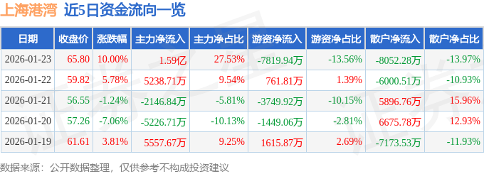 证券之星消息,截至2026年1月23日收盘,上海港湾(605598)报收于65.8元,上涨10.0%,涨停,换手率3.67%,成交量8.92万手,成交额5.77亿元。