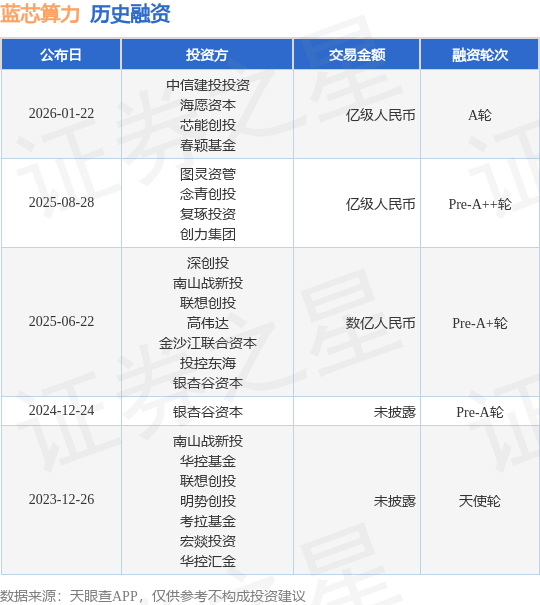 证券之星消息,根据天眼查APP于1月22日公布的信息整理,蓝芯算力(深圳)科技有限公司A轮融资,融资额亿级人民币,参与投资的机构包括中信建投投资,海愿资本,芯能创投,春颖基金。
