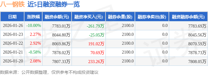 证券之星消息,截至2026年1月26日收盘,八一钢铁(600581)报收于3.24元,下跌10.0%,跌停,换手率4.38%,成交量67.09万手,成交额2.18亿元。